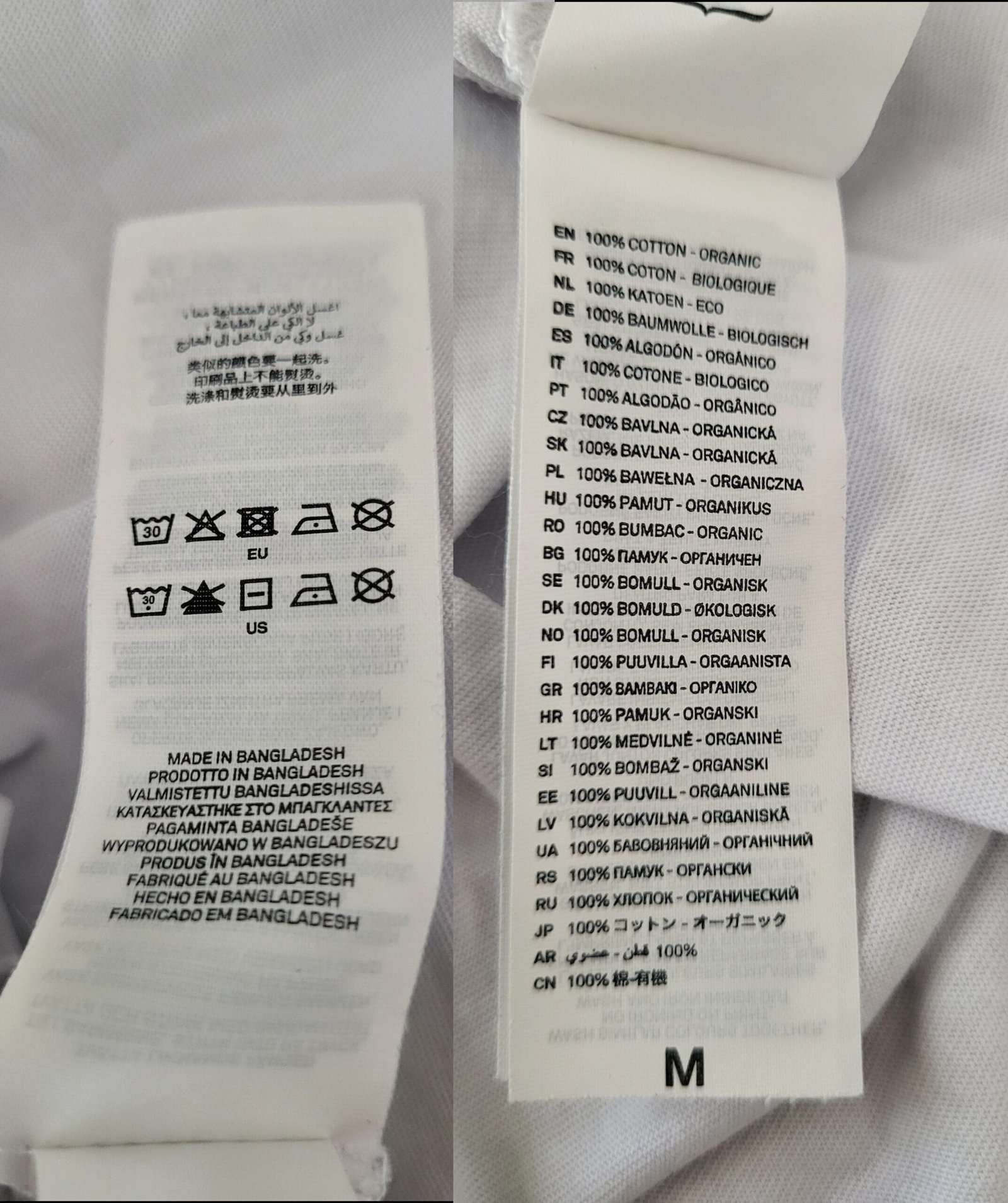 Voici un exemple d’une de nos étiquettes. Sur cette photo, on voit à droite que le t-shirt est composé de 100% de coton biologique. On a même sa taille tout en bas noté “M”. Les tailles ne sont pas obligatoires même si très utilisées.